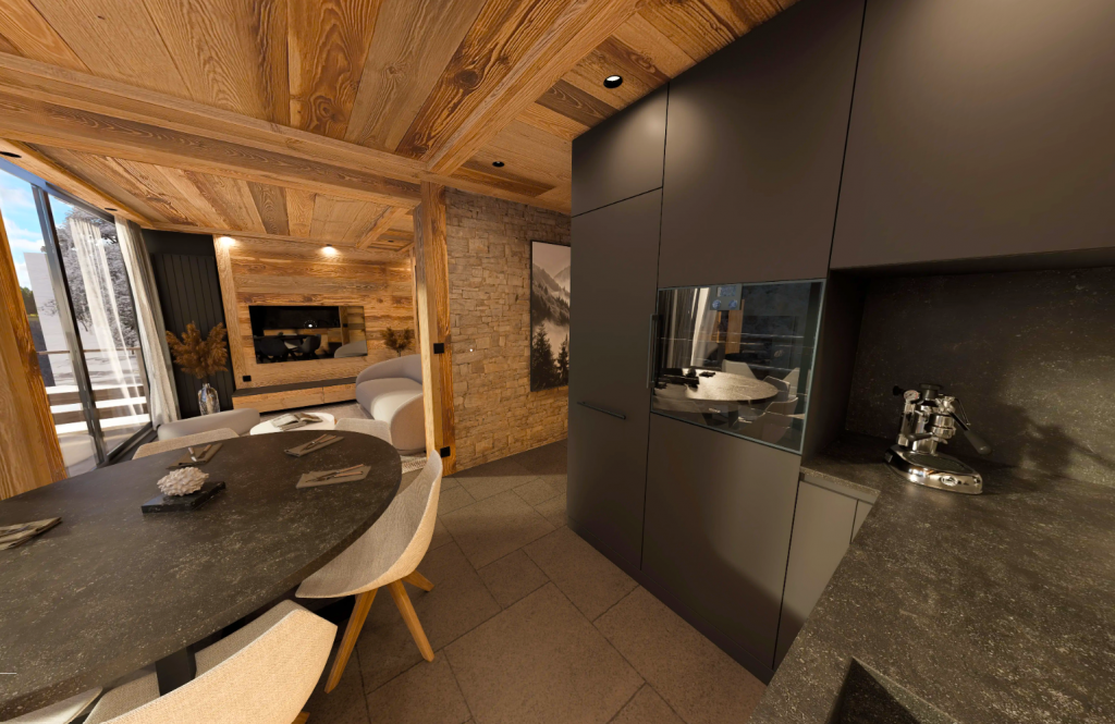 Designed as a true showcase, the apartment will undergo a complete transformation, integrating noble materials, tailor-made finishes and high-end equipment, in order to offer a level of comfort and aesthetics that meets the most demanding expectations. Its south-facing balconies will offer a spectacular panorama of the surrounding mountains, bathing the spaces in natural light and creating a permanent link with the Alpine landscape.