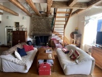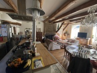 Upon entering, we discover a spacious living room with an open-plan kitchen and a monumental fireplace, as well as a large mezzanine overlooking this space with exposed beams.